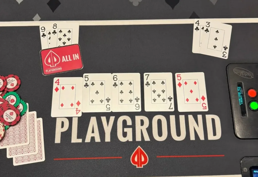 Todavia, a jogada ocorreu em uma sessão de “cash-game” com os blinds em US$ 1/US$ 2. Um dos jogadores estava com 98 de paus, enquanto o outro tinha 43 de paus. O board apresentou 4 de ouros, 5 de paus, 6 de paus, 7 de paus e 5 de ouros.