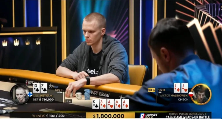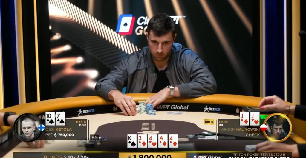 Dessa forma, a jogada em questão começou com Ossi Ketola aplicando um raise de US$ 50.000 com T7 em paus. Malinowski tinha JJ e respondeu com uma 3-Bet para US$ 200.000. Ele pensou um pouco, brincou com as fichas e pagou a aposta.